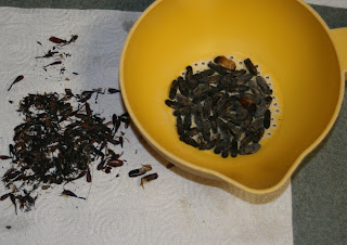 After they are frozen, shake the bag or jar they're in violently, I pounded the bottom edge of the jar against my free hand several times. Every leg or otherwise appendage breaks off nicely. Still, I pulled the hard wing sections from the beetles, much easier when frozen as they break right off. A quick rinse in the collander and they're ready for nuking!